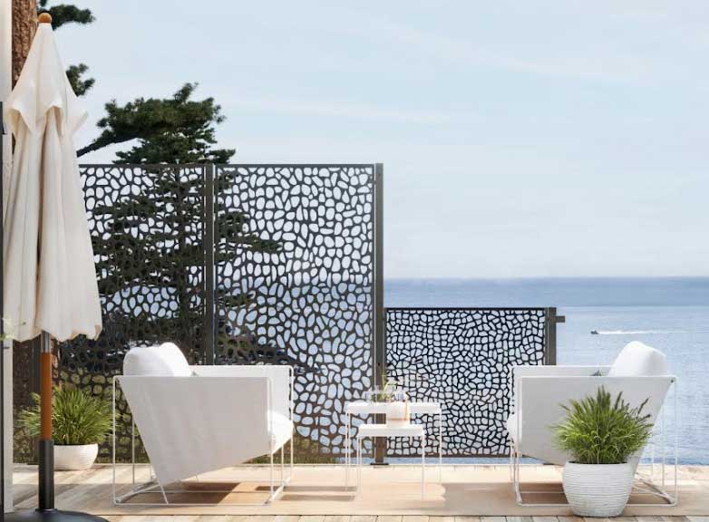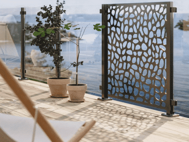 De decoratieve panelen zijn geschikt voor zowel vrijstaande toepassing als naadloze integratie met glazen balustrades. Ideaal voor blootgestelde terrassen, patio’s, zwembadzones of buitenlounges..